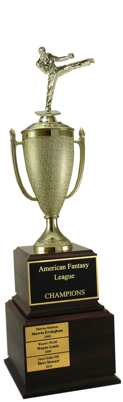 Our Perpetual Line stands over 23 inch tall (8.75 inch cup) and features a cherry wood base. Includes a Brass plate for the league / event name and enough room for 32 name plates. Price includes the main plate personalized engraving. Uses 1 x 3 flexi-brass plates for winners (additional small plates not included). Click to order Engraved Perpetual Trophy Flexi-Brass 1" x 3" Plates. Category: Karate, A great choice for acknowledging excellence and victory. Ships from: Marquette, Michigan. SKU: qskarateperp-qt.