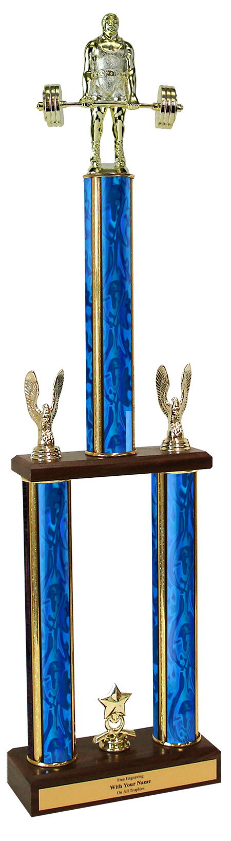 This awesome weightlifter two tier championship trophy measures approximately 26-28 inches tall and is sure to be proudly displayed by your award recipient. Includes wood base, center cup and side eagles. Price includes up to 3 lines of personalized engraving! Magnificent for honoring excellence and victory. Ships from: Marquette, Michigan. SKU: qsliftttw-tc.