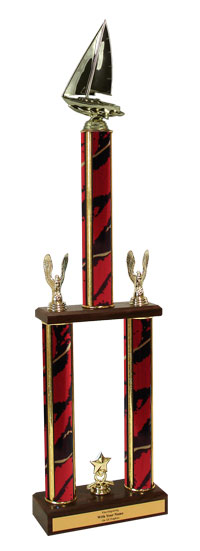 This awesome two tier championship trophy measures approximately 26-28 inches tall. Features wood base, center cup and sailboat figure. Price includes up to 3 lines of personalized engraving! Ships from: Marquette, Michigan. SKU: qssailboatttw-tc.