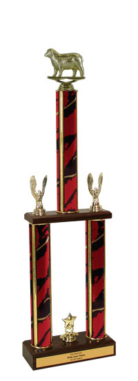 This very special two-tier championship recognition trophy with sheep figure measures approximately 26-28 inches tall. Includes wood base, center cup and side eagles. Price includes up to 3 lines of personalization! A wonderful choice for rewarding excellence and victory. Ships from: Marquette, Michigan. SKU: qssheepttw-qtt.