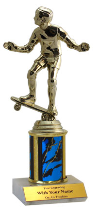 Our Skateboarding Single Column Elite Series Trophies boast a real marble base with a slant-front and free personalization. Available in 4 sizes and with choice of color! Display prominently to honor exceptional achievement and dedication. Ideal for skate parks, competitions, and recognizing tricks and technical skill. Ships from: Marquette, Michigan. SKU: qsskateboardsc-qtt.