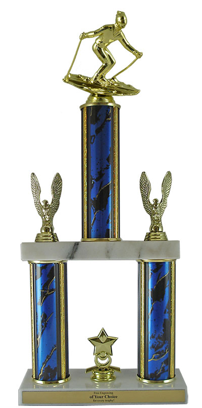 Our impressive Winners Line Award boasts two tiers, two gold eagles, a star trim, choice of column color & size, marble bases and free personalization! Perfect for special events and tournaments. Subject / Figure: Downhill Skiing. Ships from: Marquette, Michigan. SKU: qsskidowntt-qt.