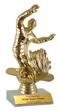 This snowboarding slim line trophy features excellent quality at a low price. Traditional white marble base with a gold snowboarder figure. Approximately 5 1/2" - 6" tall. A great choice for acknowledging excellence and victory. Ships from: Marquette, Michigan. SKU: qssnowboardnc-qtt.
