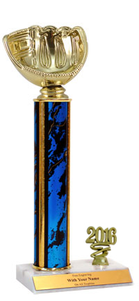 Choose from several sizes and column colors. Base: marble. Top figure: Softball Glove. Year Trim Trophy Line. A great choice for acknowledging excellence and victory. Display prominently to honor powerful hitting and defensive skill. Perfect for fastpitch, slowpitch, and recognizing hitting and fielding excellence. Ships from: Marquette, Michigan. SKU: qsbasebglyr-qt.