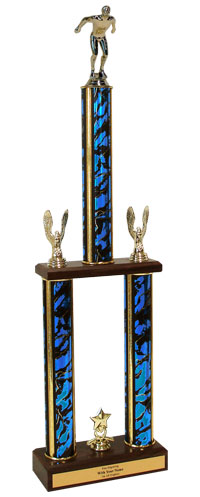 This awesome two-tier championship trophy with Swimming figure measures approximately 26-28 inches tall and is sure to be proudly displayed by your award recipient. Swimming championship trophies include a wood base, center cup and side eagles. Price includes up to 3 lines of personalized engraving! Perfect for swimming season competitions and meet awards. Ships from: Marquette, Michigan. SKU: qsswimttw-qt.