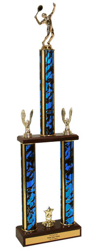 This awesome two-tier championship trophy with Tennis figure measures approximately 26-28 inches tall and is sure to be proudly displayed by your award recipient. Tennis championship trophies include a wood base, center cup and side eagles. Price includes up to 3 lines of personalized engraving! Ideal for tennis season tournaments and match celebrations. Ships from: Marquette, Michigan. SKU: qstennisttw-qt.