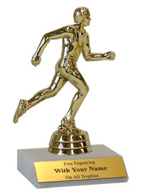 Our inexpensive, but high-quality classic participation trophy is ideal for those on a tight budget! Platform: Genuine white marble with slant front; Size: 5 1/2 - 6 inches; Personalization free!; Figurine: Track & Field; Ships from: Marquette, Michigan. SKU: qstracknc-qt.