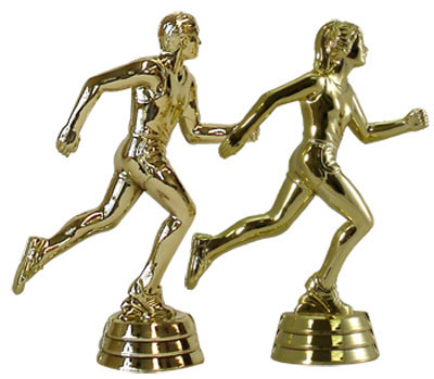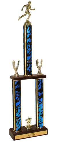 This awesome two-tier championship trophy with Track figure measures approximately 26-28 inches tall and is sure to be proudly displayed by your award recipient. Track championship trophies include a wood base, center cup and side eagles. Price includes up to 3 lines of personalized engraving! Outstanding for honoring track excellence and achievement. Ships from: Marquette, Michigan. SKU: qstrackttw-qt.