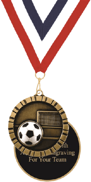 These Soccer 3D Relief Medals measure 2" in diameter, feature a gold finish, great price and fast 1-2 day shipping. Price includes 7/8"x30" red, white and blue neck ribbon! Optional personalized engraving, up to 3 lines, available on Mylar disc on medal back. Great for soccer season awards and tournament victories. Ships from: Marquette, Michigan. SKU: qush3dsoccerme-qt.