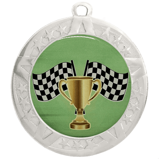These racing insert medals feature a 2 3/4 inch silver frame with a colorful 2 inch Epoxy dome subject sticker. Each medal also includes a red, white and blue neck ribbon. Optional personalization on back. Wonderful for celebrating accomplishments and milestones. Ships from: Marquette, Michigan. SKU: racing-jisf-tc.