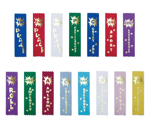 Titles include: 1st through 3rd Place, birthday, citizenship, most improved, perfect attendance plus many more! 1-5/8" x 6" . - Please select below. Minimum quantity: 25. Titles can be mixed (color of ribbon/print color is standard and can't be changed). Ships from: Topeka, Indiana. SKU: res6xx-tw.