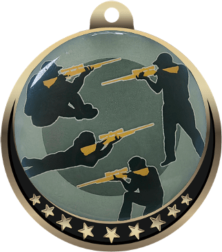 These colorful Rifle insert medals were designed exclusively for Trophy Central! Each medal features an antique gold frame with a star design and 2" Epoxy dome decal insert for a spectacular look. Medals also include a red, white and blue neck ribbon. Medal frame measures 2 3/8". Optional personalization on back. A great choice for acknowledging excellence and victory. Ships from: Marquette, Michigan. SKU: rifle-mc-tc.