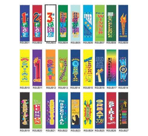 Available in 1st through 3rd Place, Participant and many more! 2" x 8" (pinked top). Minimum quantity: 25. Titles can be mixed (sorry, color of ribbon / print color is standard and can't be changed). These ribbons Ships from: Topeka, Indiana. SKU: rsubxx-tw.