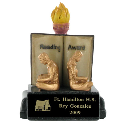 This fabulous Reading Trophy is made of sculptured resin, hand painted and lacquered. Reading Award Trophies include a 2 7/8" x 1" black plate and up to 3 lines of personalized engraving in gold. This wonderful trophy is a great way to motivate and recognize your young readers! Distinguished piece to elegantly recognize reading excellence and comprehension skills. Ships from: Mount Vernon, New York. SKU: ts1003-cm.