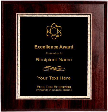 This science fair award plaque features a stock science fair symbol, your text personalized engraving and a beautiful Cherry wood finish. Use our personalization wizard and select 'Use popular template' or create your own unique design! You can also change the image to another one if you prefer. science fair plaques are available in three popular sizes, 9"x7", 10"x8" and 12"x9". Please select below. Stock artwork and text personalized engraving is free! Shown with a black personalized engraving plate with gilded edge. Outstanding for acknowledging science excellence and achievement. Ships from: Marquette, Michigan. SKU: science-plaque-tc.