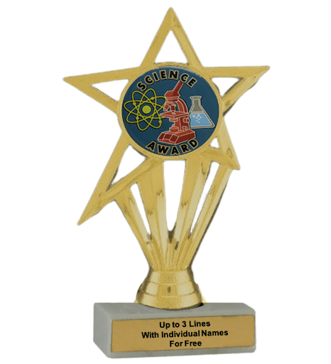 Our economy insert trophy features a real white marble base with a gold insert holder and 2" science fair insert. Measures approximately 6 7/8" - 7 1/8" tall. Add up to three lines of text personalized engraving for free, including individual names! Outstanding for acknowledging science excellence and achievement. Ships from: Marquette, Michigan. SKU: science-e-part-i-tc.
