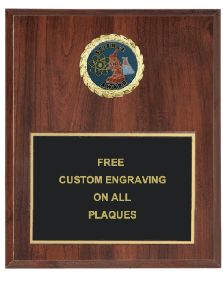 These science fair insert plaques feature a beautiful wood finish with a colorful 2 inch Epoxy dome insert. Select plaque size (7x9 or 8x10), finish (Cherry or Black) and orientation (Vertical or Horizontal) below. Price includes free text personalized engraving! Logo personalized engraving is optional. Outstanding for acknowledging science excellence and achievement. Ships from: Marquette, Michigan. SKU: science-plaque-i-tc.