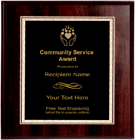 This community service award plaque features a stock service logo, your text personalized engraving and a beautiful Cherry wood finish. After pressing the personalization button below, select 'Use popular template' and then enter your own text. You can also change the design to something unique! Community service plaques are available in three popular sizes, 9"x7", 10"x8" and 12"x9". Please select below. Stock artwork and text personalized engraving is free! Shown with a black personalized engraving plate with gilded edge. Outstanding for celebrating art skills and dedication. Ships from: Marquette, Michigan. SKU: community-service-plaque-tc.