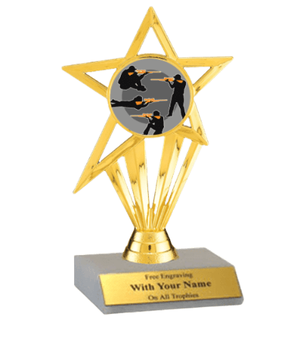 This insert participation trophy features a slant-front white marble base with a gold insert holder and 2" Shooting design insert. Measures approximately 7" tall. Outstanding for celebrating art skills and dedication. Ships from: Marquette, Michigan. SKU: insert-participation-shooting-tc.