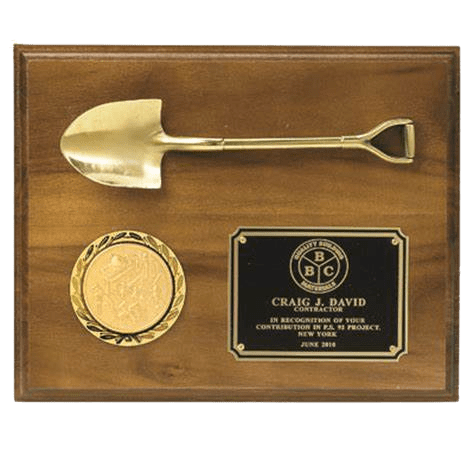 If you are breaking new ground on a building or project, this beautiful shovel plaque is for you. Choice of walnut finish or genuine walnut. Price includes 2 inch insert and up to six lines of personalized engraving on a 3" x 4" plate. Ships from: Mount Vernon, New York. SKU: ps595xg-cm.