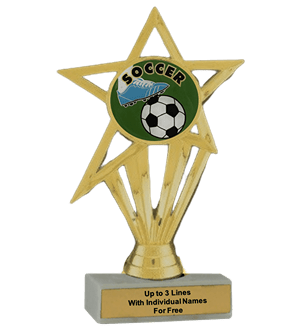Our economy insert trophy features a real white marble base with a gold insert holder and 2" Soccer insert. Measures approximately 6 7/8" - 7 1/8" tall. Add up to three lines of text personalized engraving for free, including individual names! Great for soccer season awards and tournament victories. Ships from: Marquette, Michigan. SKU: soccer-e-part-i-tc.