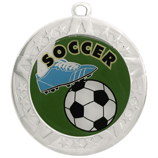 These Soccer insert medals feature a 2 3/4 inch silver frame with a colorful 2 inch Epoxy dome subject decal. Each medal also includes a red, white and blue neck ribbon. Optional personalization on back. Great for soccer season awards and tournament victories. Ships from: Marquette, Michigan. SKU: soccer-jisf-tc.