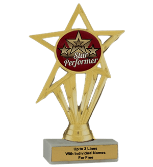 Our economy insert trophy features a real white marble base with a gold insert holder and 2" Star Performer insert. Measures approximately 6 7/8" - 7 1/8" tall. Up to three text personalized engraving free, including individual names! Magnificent for celebrating excellence. Ships from: Marquette, Michigan. SKU: star-performer-e-part-i-tc.