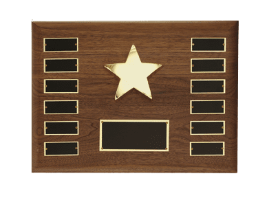 Want to recognize that special office employee? What about the star of the play or theater production? Solid American Walnut! Measures 11" x 15". Price includes all plates, top personalized engraving, and personalized engraving on first plate. personalized engraving on future plates at minimal charge. Please see our corporate recognition/Office Award section for additional offerings. Magnificent for honoring excellence and victory. Ideal for employee of the month programs and workplace recognition. Ships from: Chicago, Illinois. SKU: starplaque.