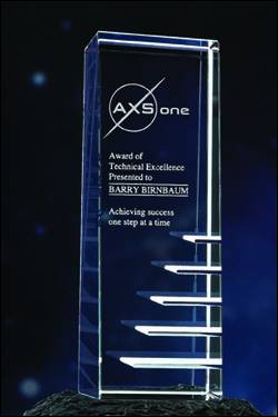 This intriguing piece of optical crystal highlights a series of steps magically cut within. One step at a time, the eye is led upward until it reaches your message of approval. A fine example of the beauty that resides in simplicity, this award is a visual metaphor or one's ascent to the top. A romance card elaborating this theme is included for your presentation. Magnificent for recognizing excellence and victory. SKU: 190-jc.