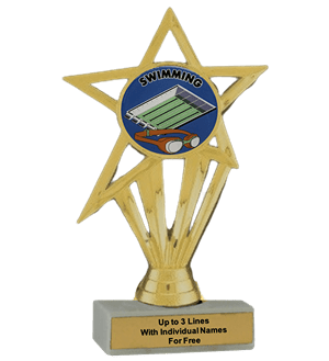 Our economy insert trophy features a real white marble base with a gold insert holder and 2" Swimming insert. Measures approximately 6 7/8" - 7 1/8" tall. Add up to three lines of text personalized engraving for free, including individual names! Perfect for swimming season competitions and meet awards. Ships from: Marquette, Michigan. SKU: swimming-e-part-i-tc.