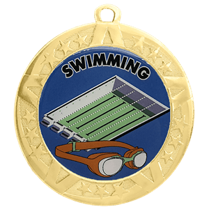 These Swimming insert medals feature a 2 3/4 inch gold frame with a colorful 2 inch Epoxy dome subject decal. Each medal also includes a red, white and blue neck ribbon. Optional personalization on back. Perfect for swimming season competitions and meet awards. Ships from: Marquette, Michigan. SKU: swimming-jigf-tc.