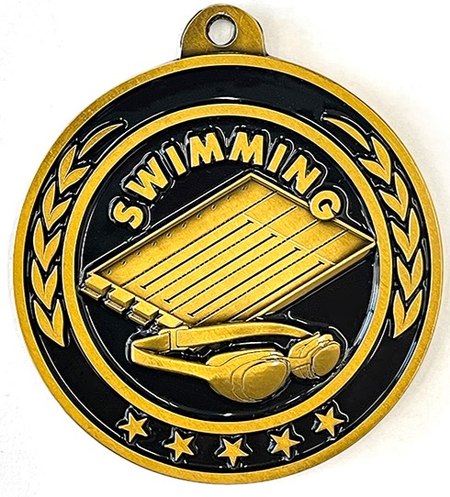 Our antique gold swimming medal was designed exclusively for Trophy Central! Each medal features a black color-fill for a unique look and includes a red, white and blue neck ribbon. Medal measures 2 1/4". Optional personalization on back. Perfect for swimming season competitions and meet awards. Ships from: Marquette, Michigan. SKU: swimming-mg-tc.