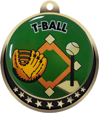 These colorful T-Ball insert medals were designed exclusively for Trophy Central! Each medal features an antique gold frame with a star design and 2" Epoxy dome decal insert for a spectacular look. Medals also include a red, white and blue neck ribbon. Medal frame measures 2 3/8". Optional personalization on back. Magnificent for honoring excellence and victory. Ships from: Marquette, Michigan. SKU: t-ball-mc-tc.