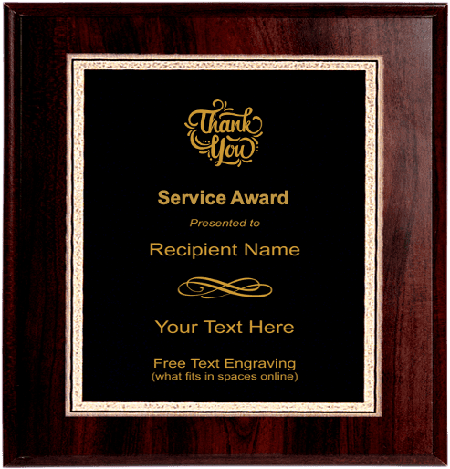 This Thank You award plaque features a stock thank-you logo, your text personalized engraving and a beautiful Cherry wood finish. After pressing the personalization button below, select 'Use popular template' and then enter your own text. You can also change the design to something unique! Thank-You plaques are available in three popular sizes, 9"x7", 10"x8" and 12"x9". Please select below. Stock artwork and text personalized engraving is free! Shown with a black personalized engraving plate with gilded edge. Outstanding for celebrating art skills and dedication. Ships from: Marquette, Michigan. SKU: thank-you-plaque-tc.