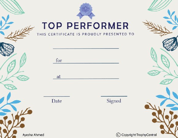 This is a free Top Performer certificate template! Our free certificates were designed to be printable and use less ink to save you money. Simply press the View Now Button and then right click on the image and select Save File to download it. Award certificates measure 8 1/2" x 11". Outstanding for rewarding achievement and success. SKU: top-performer-free-tc.