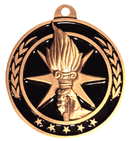 These antique gold Torch medals were designed exclusively for Trophy Central! Each medal features a black-color-fill for a unique look. Medals also include a red, white and blue neck ribbon. Medal measures 2 1/4". Optional personalization on back. Magnificent for honoring excellence and victory. Ships from: Marquette, Michigan. SKU: torch-mg-tc.