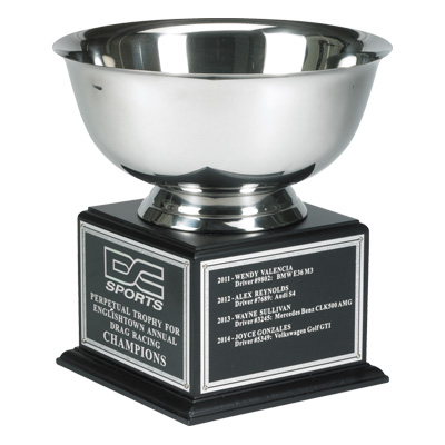 10 1/2" Perpetual Trophy with Silver Revere Bowl. Black Wood Base. Includes 4 lines of personalized engraving on front. Supplied with 4 Full plates (personalized engraving additional). Magnificent for honoring excellence and victory. Ships from: Mount Vernon, New York. SKU: tr7219-cm.