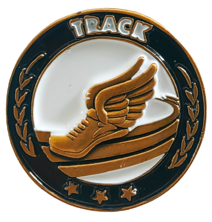 Discontinued (slightly imperfect) - 50%+ off!. These enamel Track lapel pins feature a black color-fill for a unique look. The pin back includes a clutch-pin for easy and safe attachment to clothing. Measures 7/8". Minimum Quantity: 10. SKU: W6-TC.