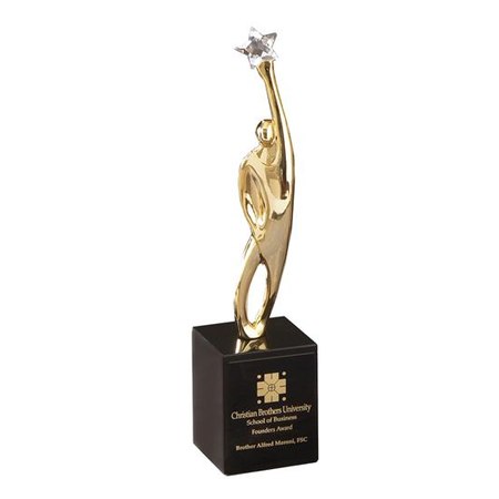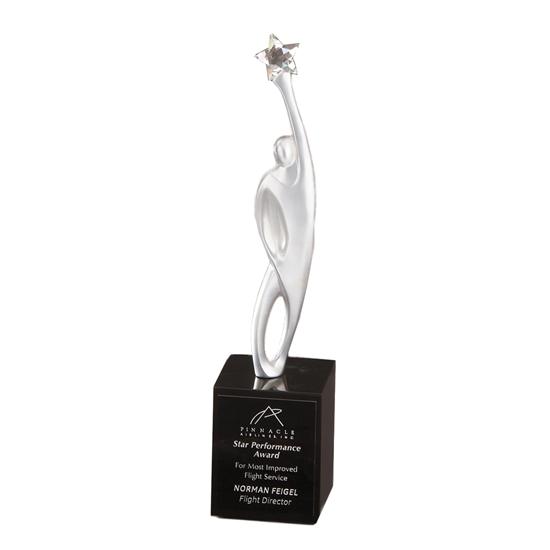 Reach the stars in Triumph with this inspiring award trophy. Hand cast figure plated in one of two finishes (Satin Silver or Gold) holding a crystal star. Rests on a tall, ebony finished stonecast base (new models use rectangular base, not octagon base shown). Measures 10 1/2" high. Ships from: Chicago, Illinois. SKU: 35xx-rs.