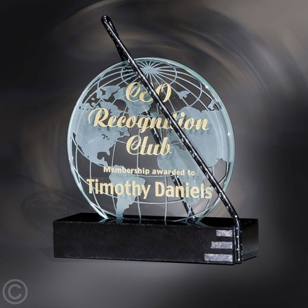 Your world of thanks message is conveyed in a most striking manner on this unique global recognition award! Silver-flecked metal wraps around a glistening glass disc with the world graphics expertly carved. The Trajectory Award features an Ebony marble base and is also available without world background. Please send any camera-ready artwork to sales@trophycentral.com; artwork must be in vector format (ex.eps or.ai file). Please Note: personalized engraving & artwork are for illustrative purposes only; all awards start blank. If you would like a design similar to one shown on a sample, please contact us for availability or pricing. SKU: vftm012xx-va.