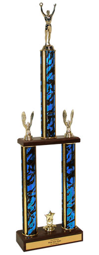 This very special two tier championship recognition trophy with victory figure measures approximately 26-28 inches tall. Features a wood base, center cup and side eagles. Price includes up to 3 lines of personalization! Ships from: Marquette, Michigan. SKU: qtsvictttw-qt.
