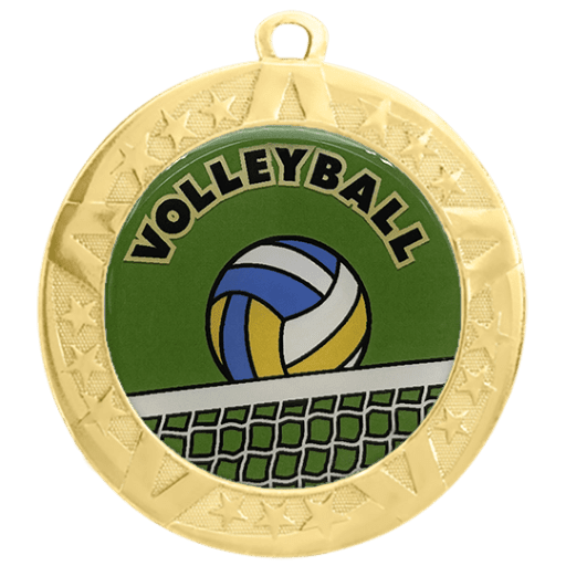These Volleyball insert medals feature a 2 3/4 inch gold frame with a colorful 2 inch Epoxy dome subject decal. Each medal also includes a red, white and blue neck ribbon. Optional personalization on back. Outstanding for rewarding volleyball excellence and achievement. Ships from: Marquette, Michigan. SKU: volleyball-jigf-tc.