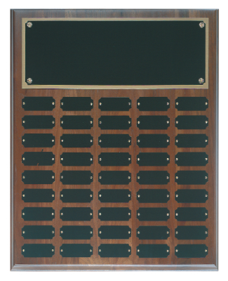 This Step-Edge Walnut finish perpetual plaque features 45 nameplates and is perfect for your school, business or organization. The price of this perpetual plaque includes personalized engraving for the top plate and one nameplate (personalized engraving for additional plates is also available). Step-Edge Plaques measure 16" x 20". Ships from: Marquette, Michigan. SKU: wpp45-jdstc.