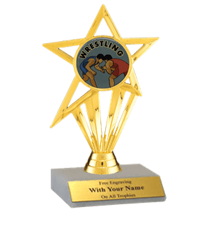 This insert participation trophy features a slant-front white marble base with a gold insert holder and 2" Wrestling design insert. Measures approximately 7" tall. Outstanding for honoring wrestling excellence and achievement. Ships from: Marquette, Michigan. SKU: insert-participation-wrestling-tc.