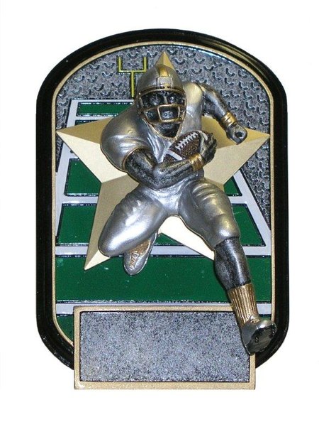 This trophy sports a unique image of a football player running forward with a football and with a colorful view of a stadium in the background. Measures 6.5 Inches in height. Price includes personalized engraving (up to 3 lines). Press the cart button to personalize your Rock N Jox trophy. Image: Perfect for football season recognition and championship honors. Ships from: Topeka, Indiana. SKU: wrj659-tw.