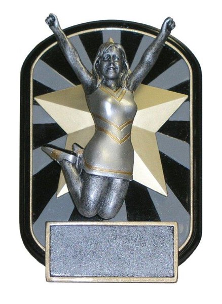 This award depicts a fabulous image of a cheerleading jumping and leading a cheer with a gold star in the background. Measures 6.5 Inches in height. Price includes personalized engraving (up to 3 lines). Press the cart button to personalize your Rock N Jox trophy. Image: Ships from: Topeka, Indiana. SKU: wrj660-tw.